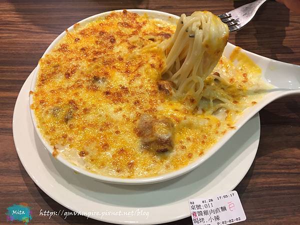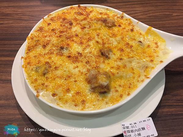 主餐部分先介紹:白醬雞肉焗烤直麵+小辣(可以選直麵、斜管麵、燉飯