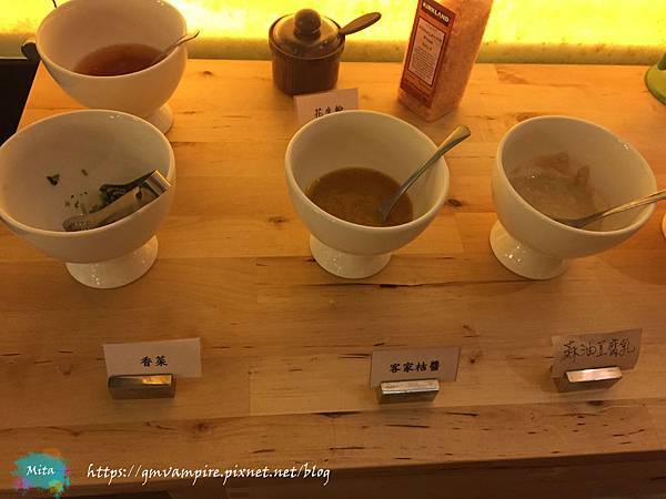 (香菜、蔥花、辣椒、客家桔醬、沙茶、蘿蔔泥、蒜泥、豆腐乳、日式醬油、花生粉、玫瑰鹽)